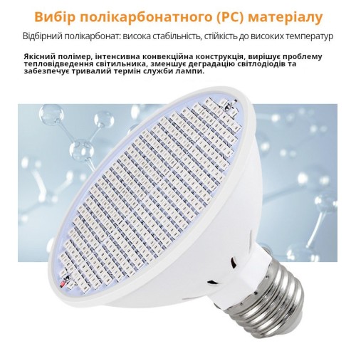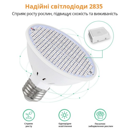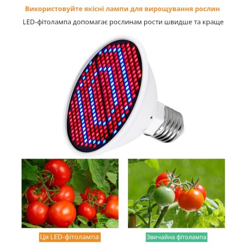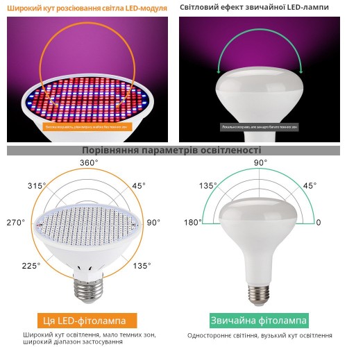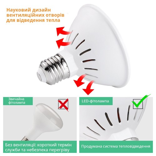 Светодиодная лампа выполнена на стандартном цоколь E27 с акцентированным синим спектром, что делает ее идеальной для формирования прочной, коренастой рассады и обеспечения интенсивной освещённости на стадии вегетативного роста. Обычно би-колор фитолампы со спектром универсального назначения имеют соотношение красного и синего света примерно 5:1. В данной фитолампе эта пропорция составляет 2,5:1, что свидетельствует об увеличенном содержании синего света в спектре.