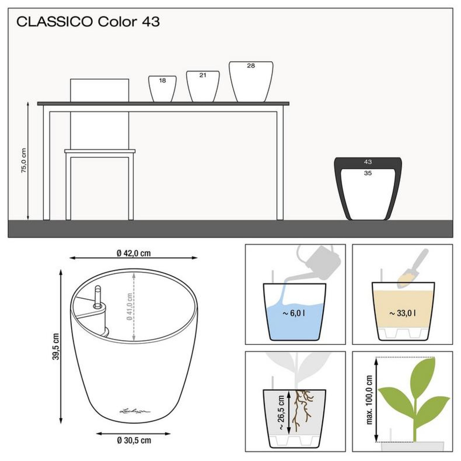 Кашпо CLASSICO Color убедительны в своей эстетике, высококачественном пластике и умных функциях. Надежная система автополива LECHUZA снабжает растения влагой, как в природе, а на открытых площадках выкрученный винт из днища кашпо защищает корни растения от застоя влаги после дождя.