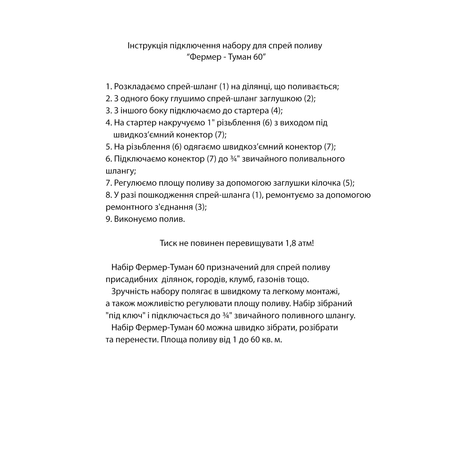 Набор для спрей полива "Фермер - Туман 60" предназначен для спрей полива приусадебных участков, огородов, клумб, газонов и т.д. Удобство набора заключается в быстром и легком монтаже, а также в возможности регулировать площадь полива. Набор собран "под ключ" и подключается к 3/4" обычного поливочного шланга. Набор "Фермер-Туман 60" можно быстро собрать, разобрать и перенести. Площадь полива от 1 до 60 кв.м.