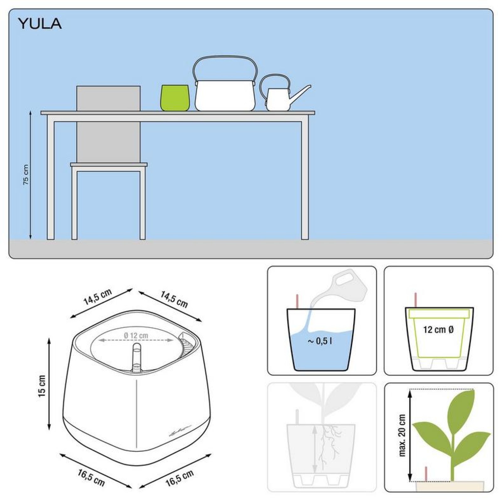З гармонійними пастельними тонами, матовими поверхнями та чистими формами колекція YULA може бути розміщена у будь-якому інтер'єрі. Невеликі апартаменти можуть бути легко прикрашені кашпо, вазами та іншими предметами YULA. Куплені рослини навіть не потрібно пересаджувати. Вони можуть залишатися у своєму горщику і поміщені в кашпо для рослин або макраме. Система автополиву забезпечує оптимальну подачу води до коріння протягом певного періоду часу. Це означає, що ручний полив більше не потрібен, і ніщо не перешкоджає поїздці у відпустку або відрядження, яке триває кілька днів. Просто заповніть резервуар для води, і рослини будуть вологою себе протягом декількох днів.