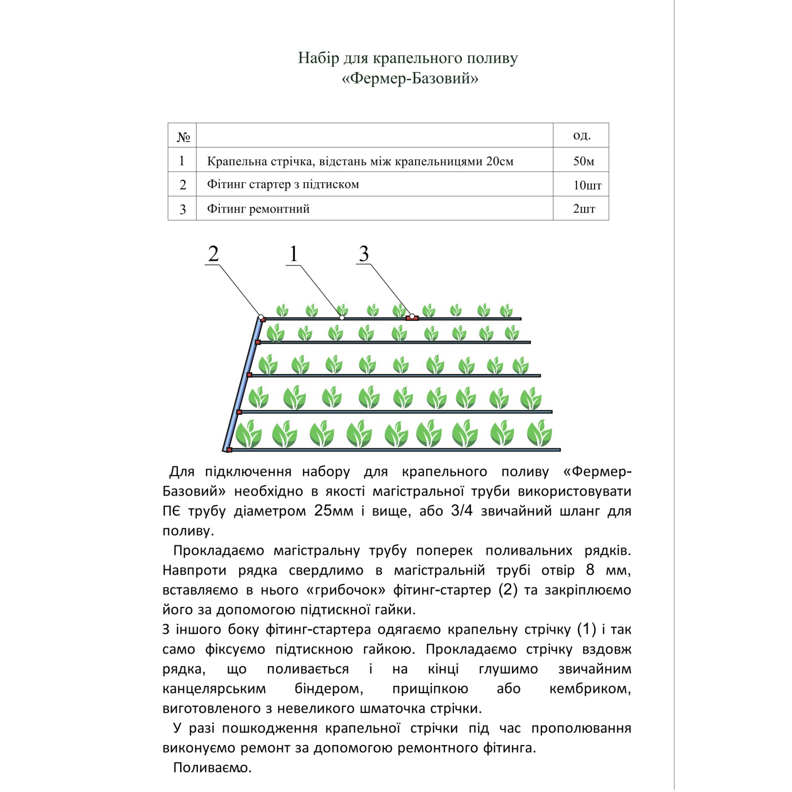 Для підключення набору крапельного поливу "Фермер-Базовий" необхідно в якості магістральної труби використовувати ПВХ трубу діаметром 32 мм і вище, або 3/4" звичайний шланг для поливу.
