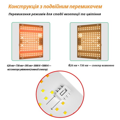 Світлодіодна фітопанель Full Spectrum GR-45 підходить для циклу росту рослин. Сині світлодіоди з довжиною хвилі 450 нм та червоні 630-650 нм, пропорція 1:2,5. Діапазон випромінювання розширено за рахунок додавання таких кольорів як білий, інфрачервоний (далекий червоний) 720 нм, ультрафіолетовий 395 нм. Такий спектр підходить для будь-якого універсального застосування (розсади, кімнатних кольорів, зелені); доречний на всіх етапах росту рослини за винятком пророщування насіння, так як далекий червоний може пригнічувати їх проростання, як тільки проросли - можна.