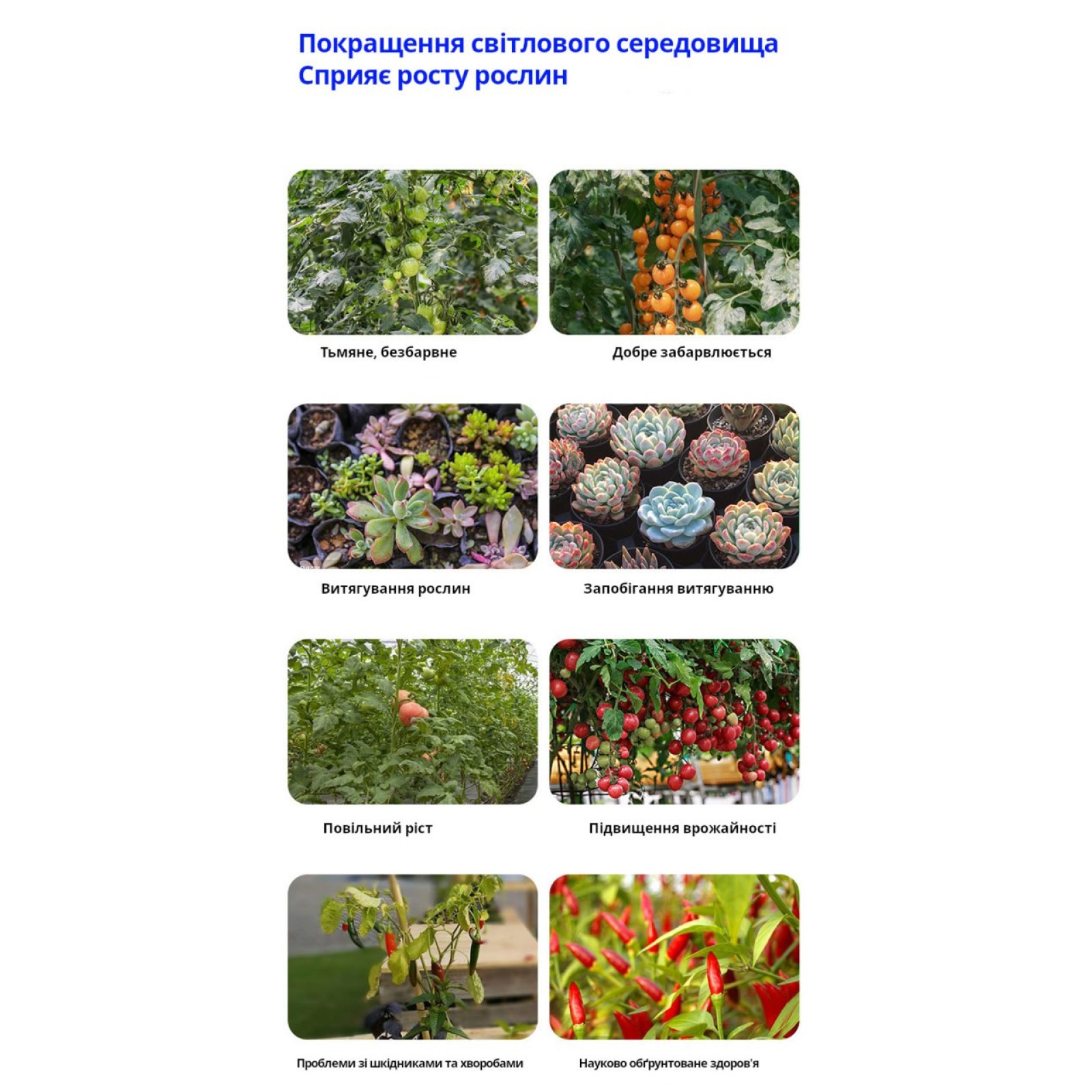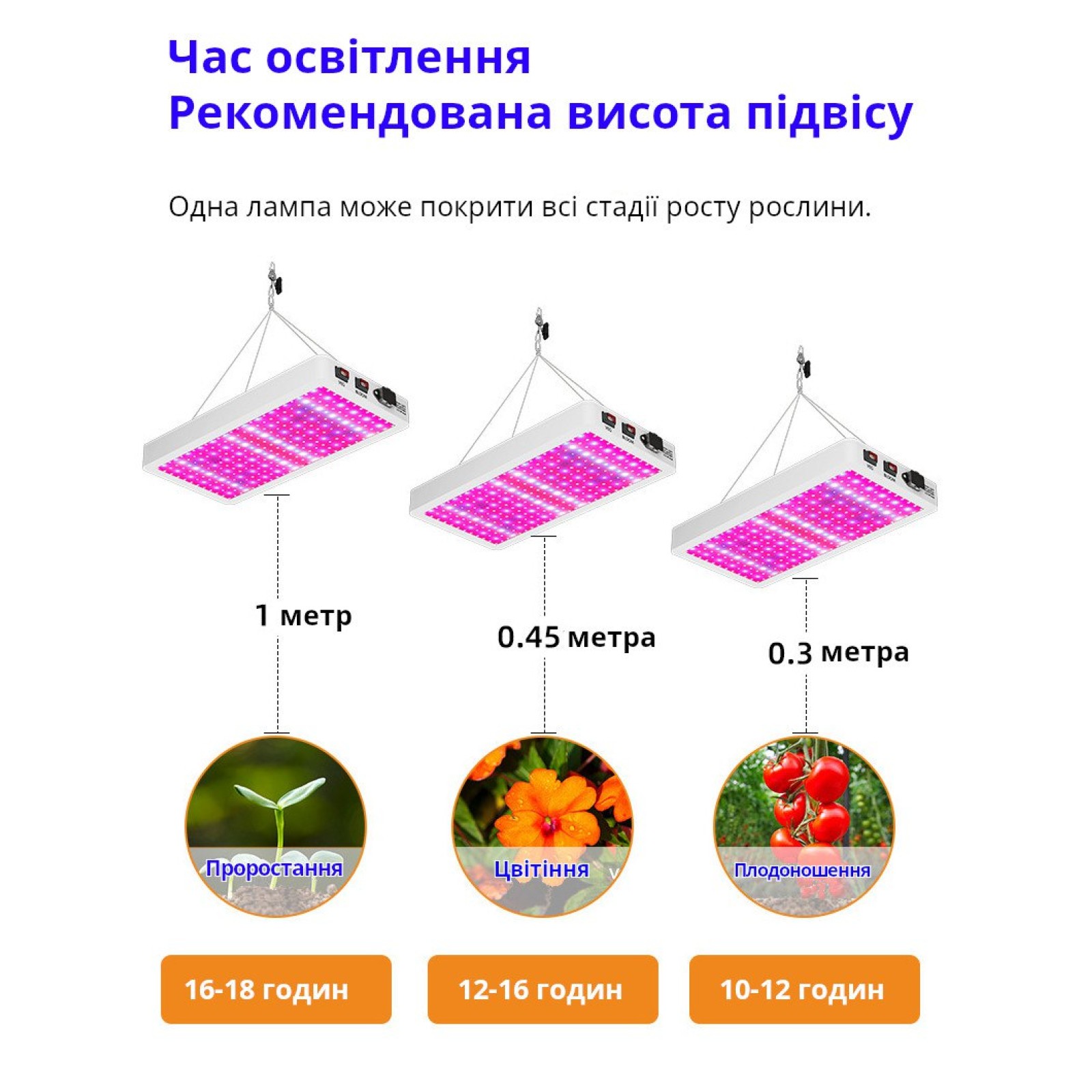 Світлодіодна фітопанель Full Spectrum GR-45 підходить для циклу росту рослин. Сині світлодіоди з довжиною хвилі 450 нм та червоні 630-650 нм, пропорція 1:2,5. Діапазон випромінювання розширено за рахунок додавання таких кольорів як білий, інфрачервоний (далекий червоний) 720 нм, ультрафіолетовий 395 нм. Такий спектр підходить для будь-якого універсального застосування (розсади, кімнатних кольорів, зелені); доречний на всіх етапах росту рослини за винятком пророщування насіння, так як далекий червоний може пригнічувати їх проростання, як тільки проросли - можна.